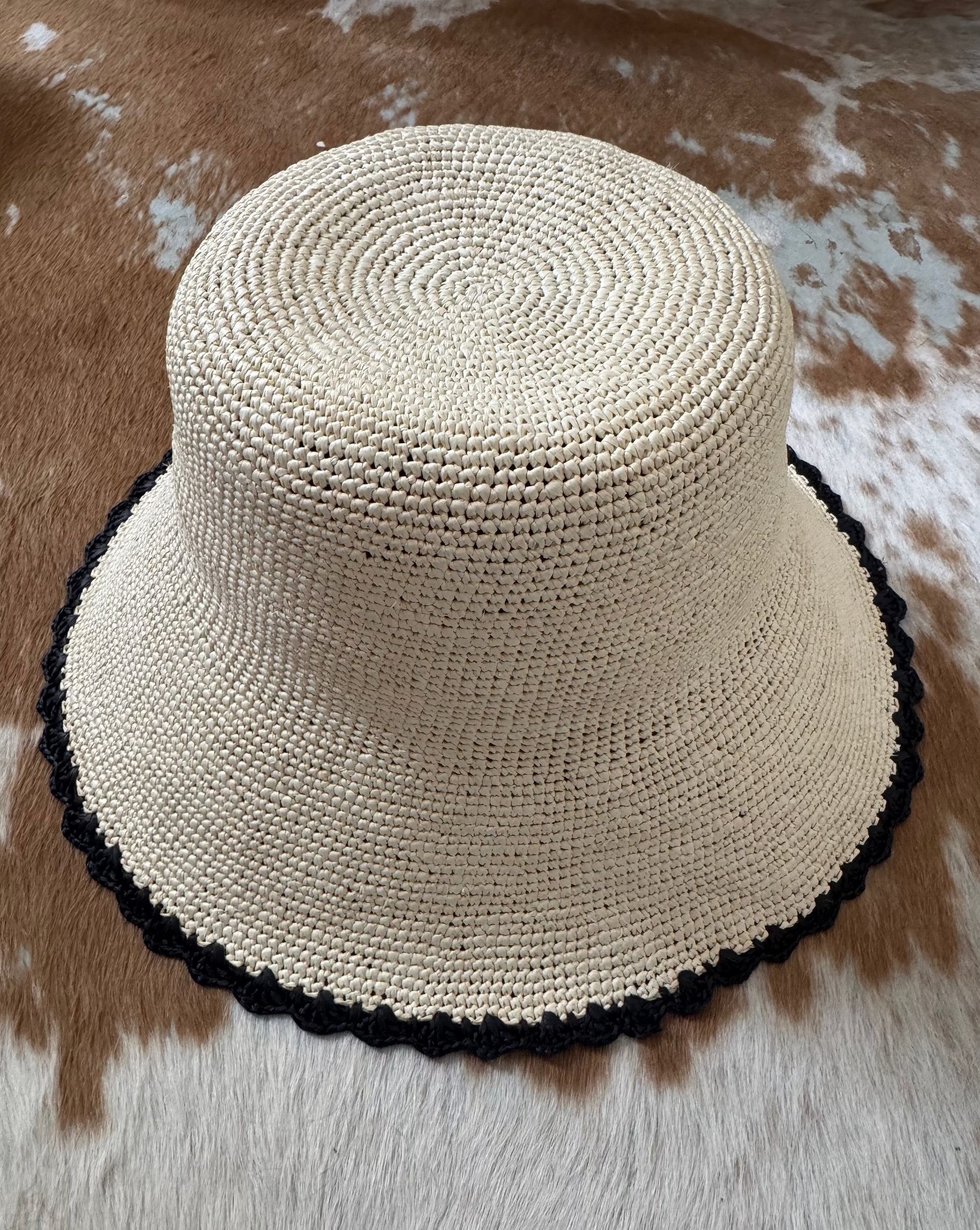 Delilah is our newest crochet bucket; with an adjustable interior band for a custom fit, slightly longer brim, and the chicest black scalloped trim, she gives the perfect amount of shade. Safe to say we’re obsessed.